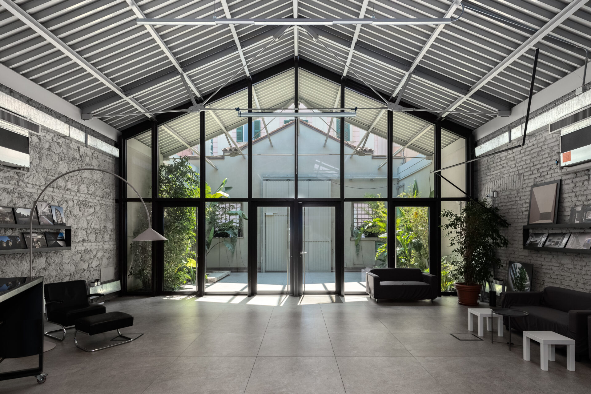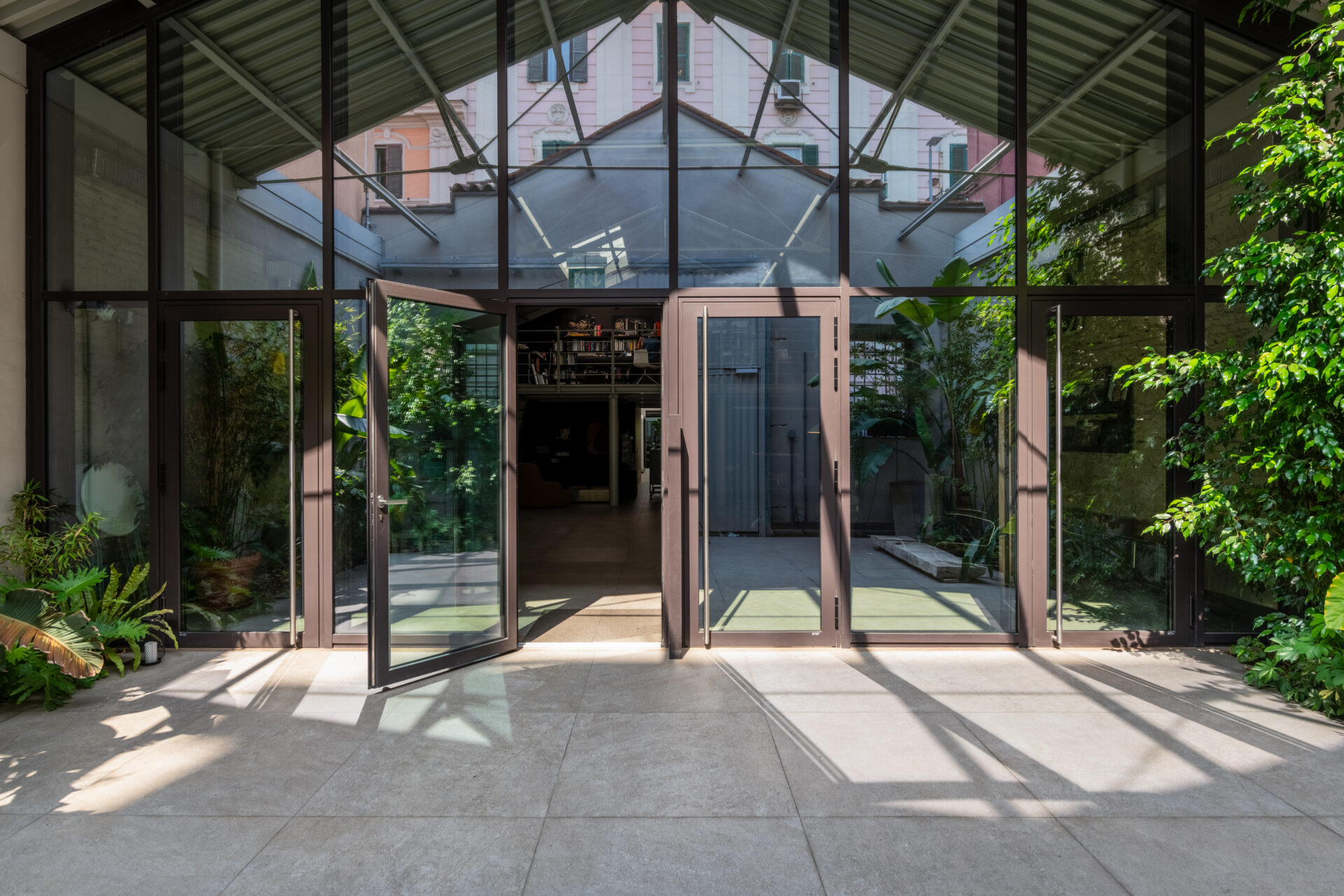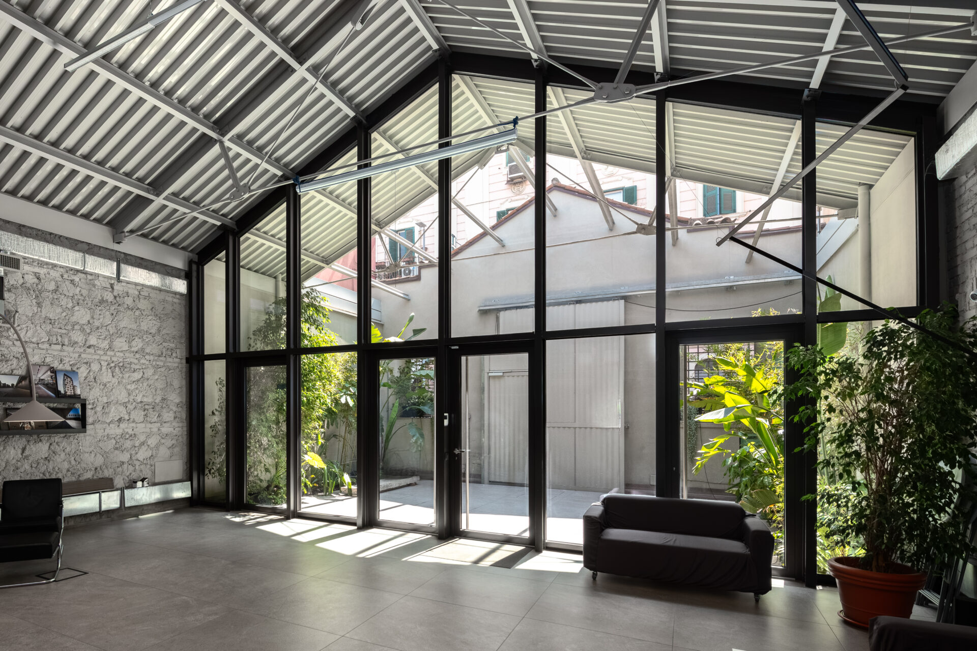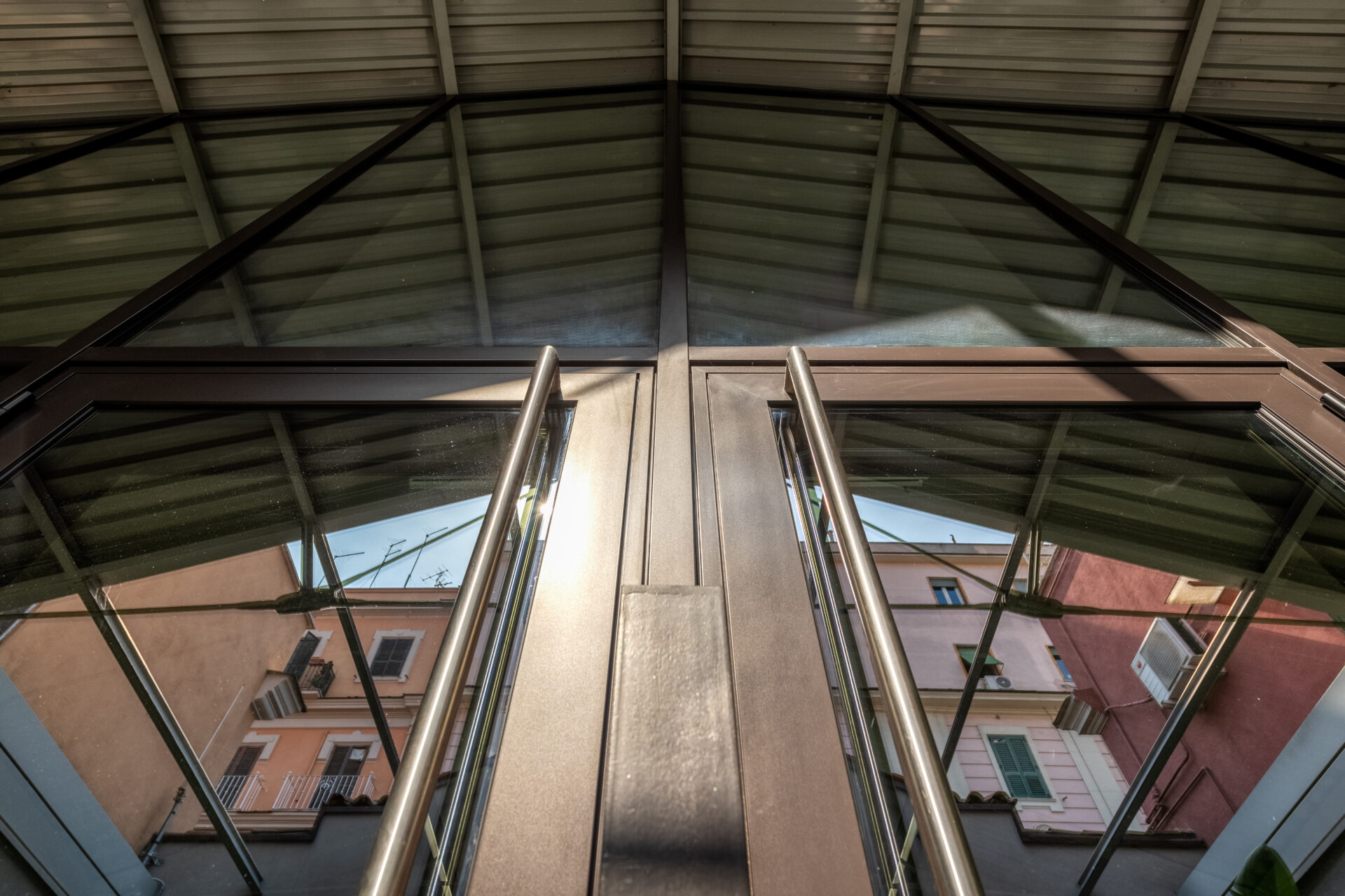 La struttura portante è stata interamente realizzata in carpenteria metallica, con elementi customizzati per adattarsi alle geometrie dell’edificio e supportare il peso e le sollecitazioni della facciata vetrata. L’interfaccia tra la carpenteria e il sistema Schüco è stata studiata nei minimi dettagli per assicurare:
