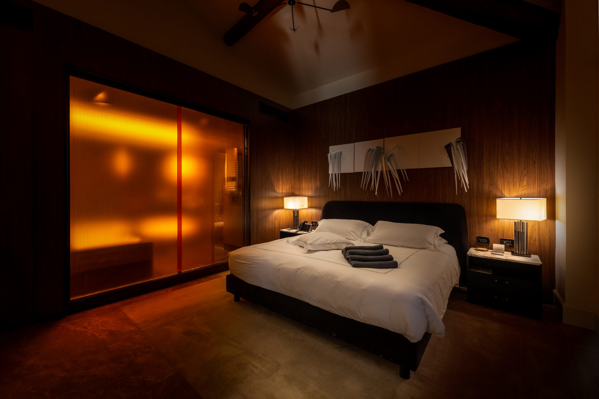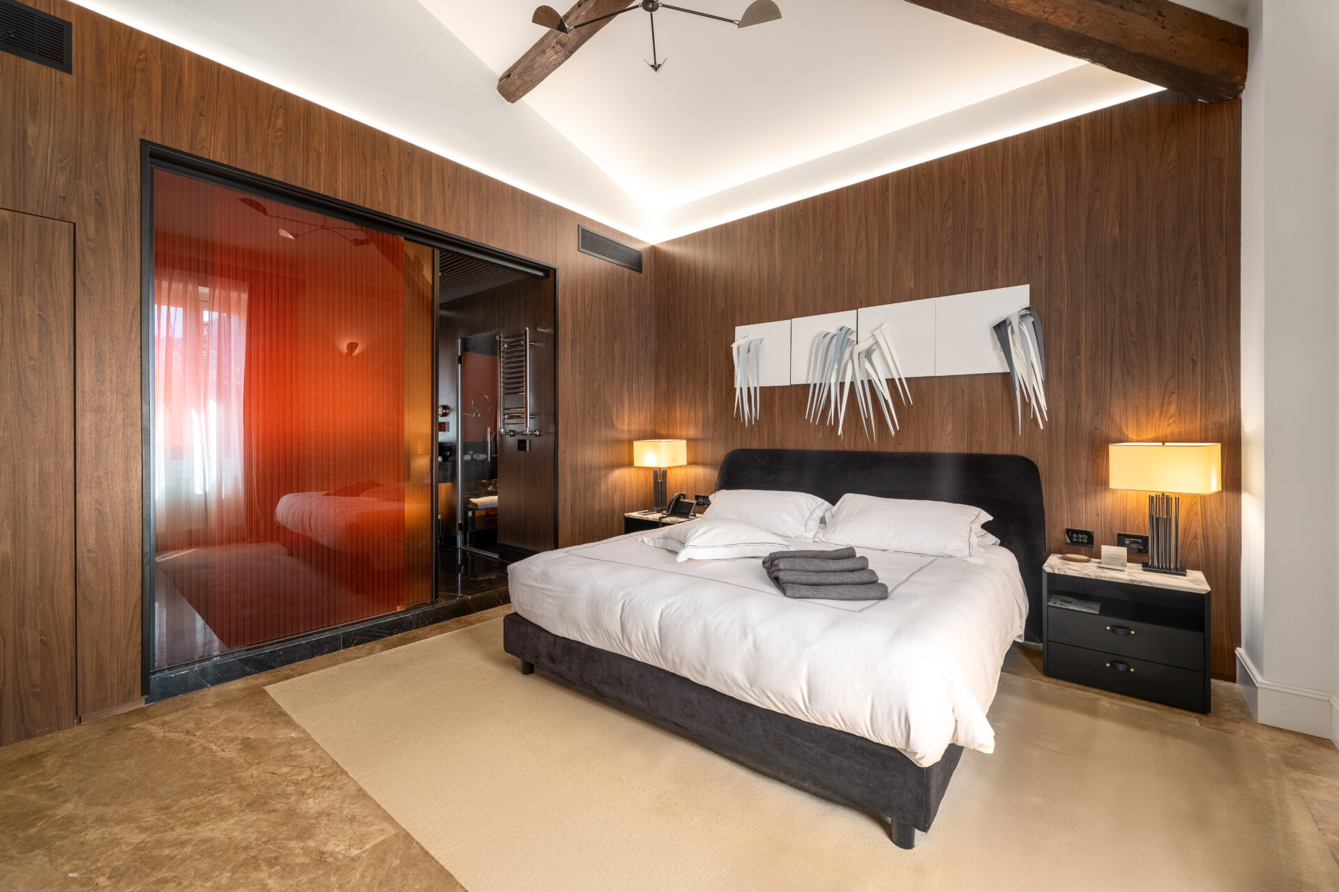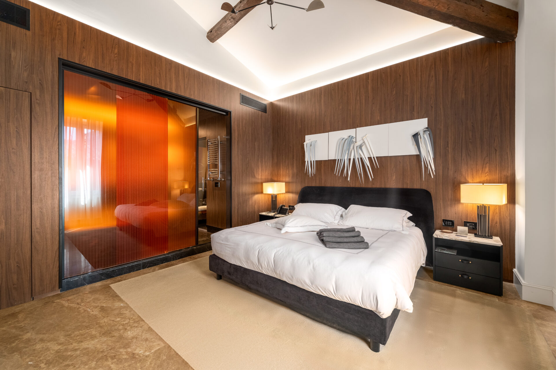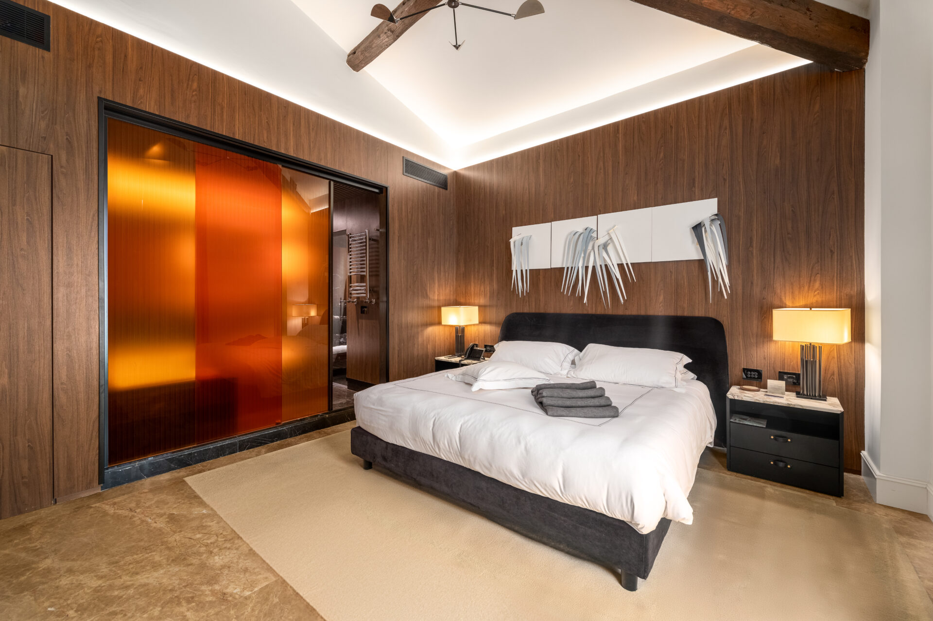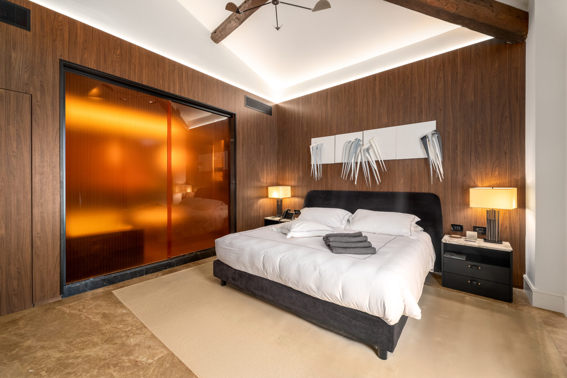In particolare, nelle camere abbiamo installato sistemi scorrevoli con vetri stratificati caratterizzati da una finitura materica superficiale e una sofisticata tonalità cognac, pensati per creare separazioni fluide e armoniose tra gli spazi.