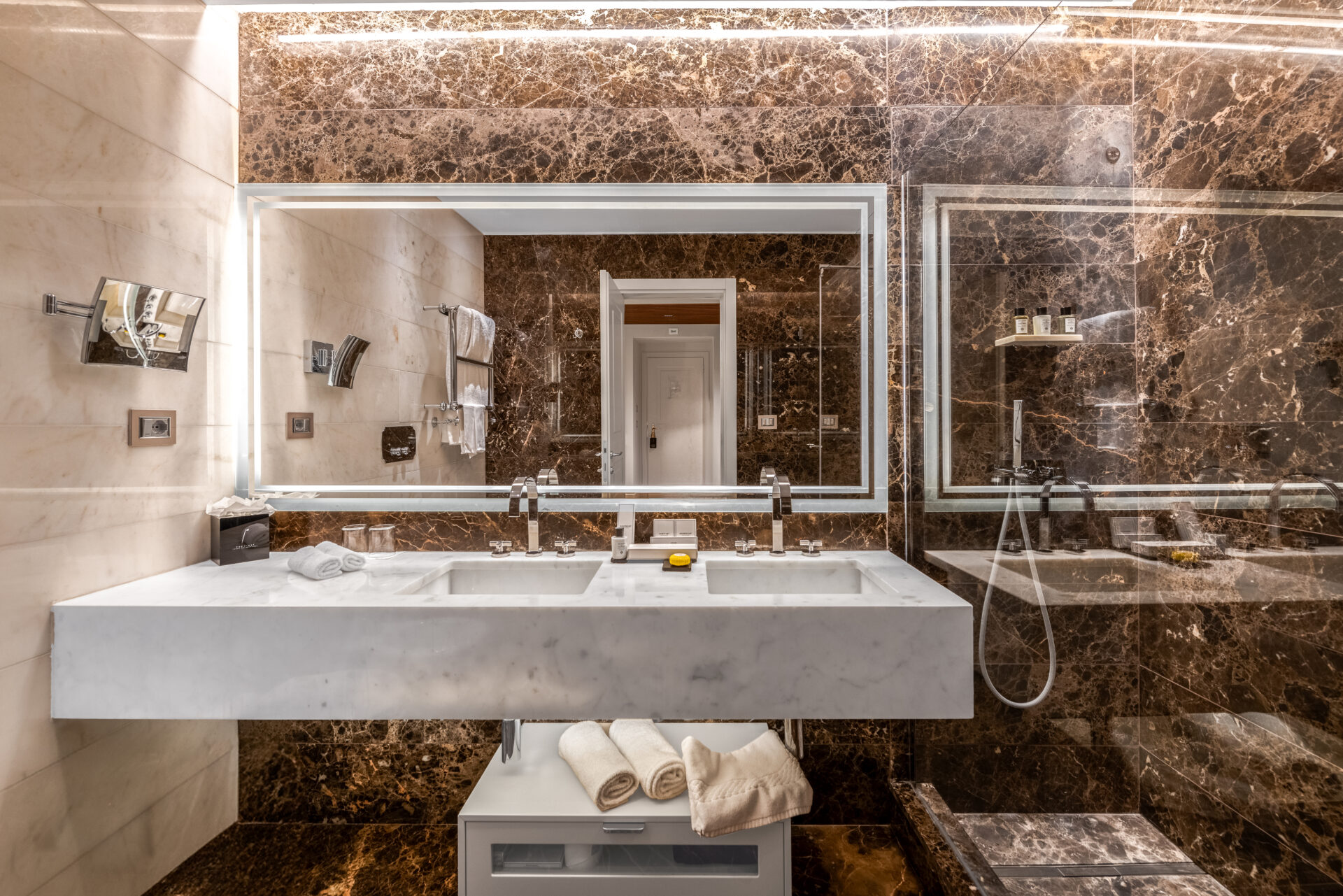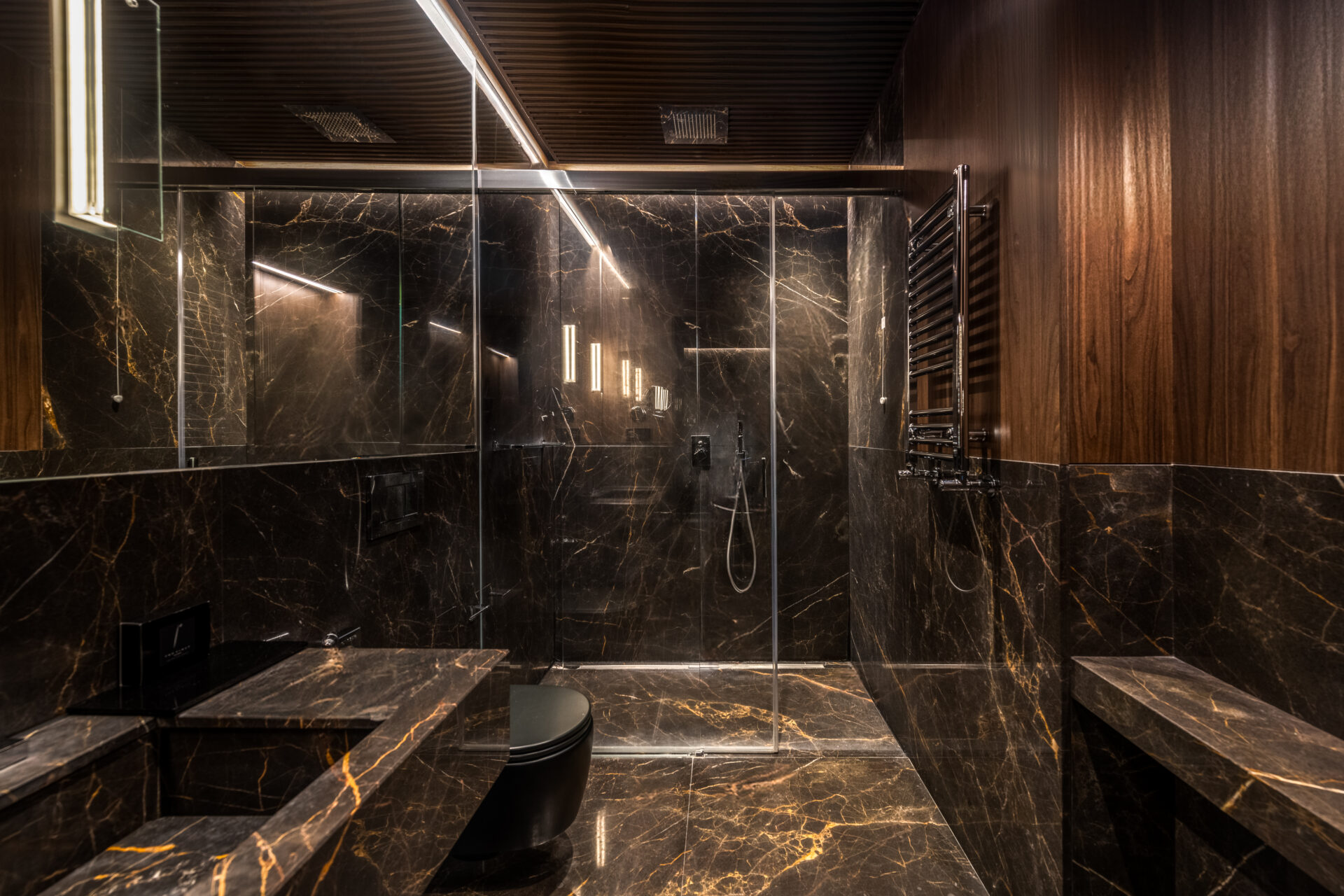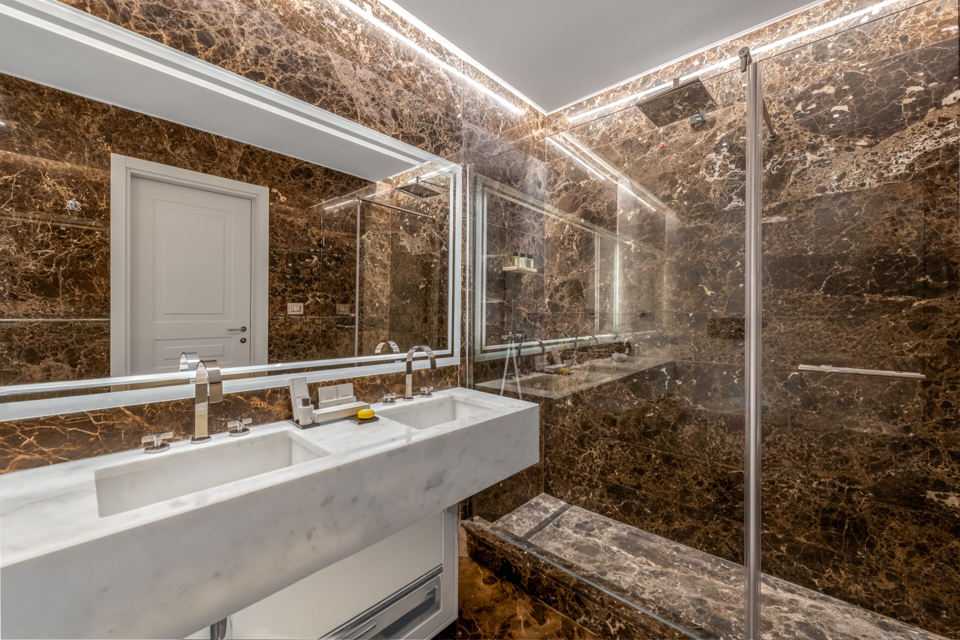 Completano il nostro intervento gli specchi su misura e i box doccia di design presenti nei bagni, anch’essi progettati e realizzati per integrarsi perfettamente con lo stile ricercato della struttura.