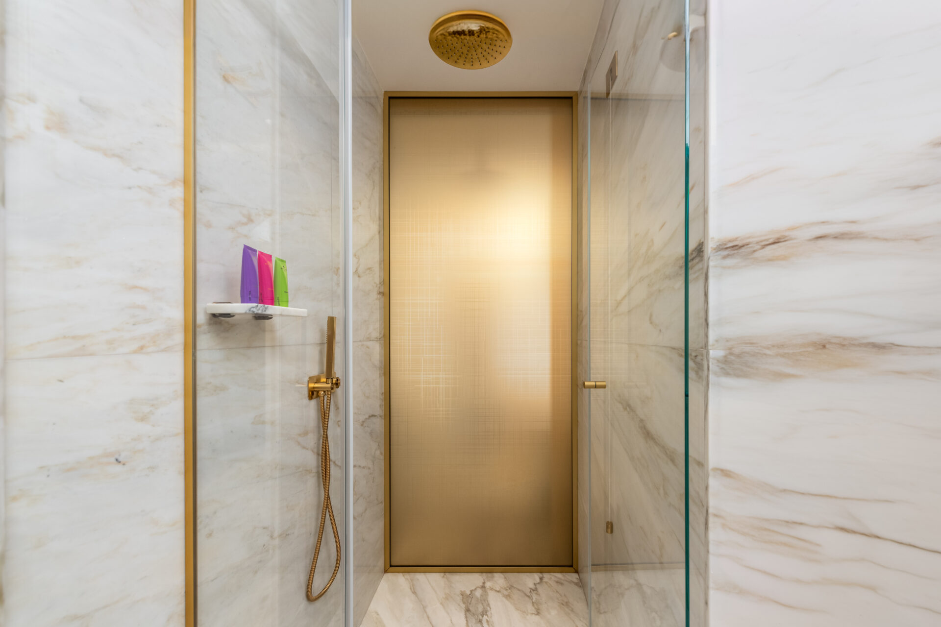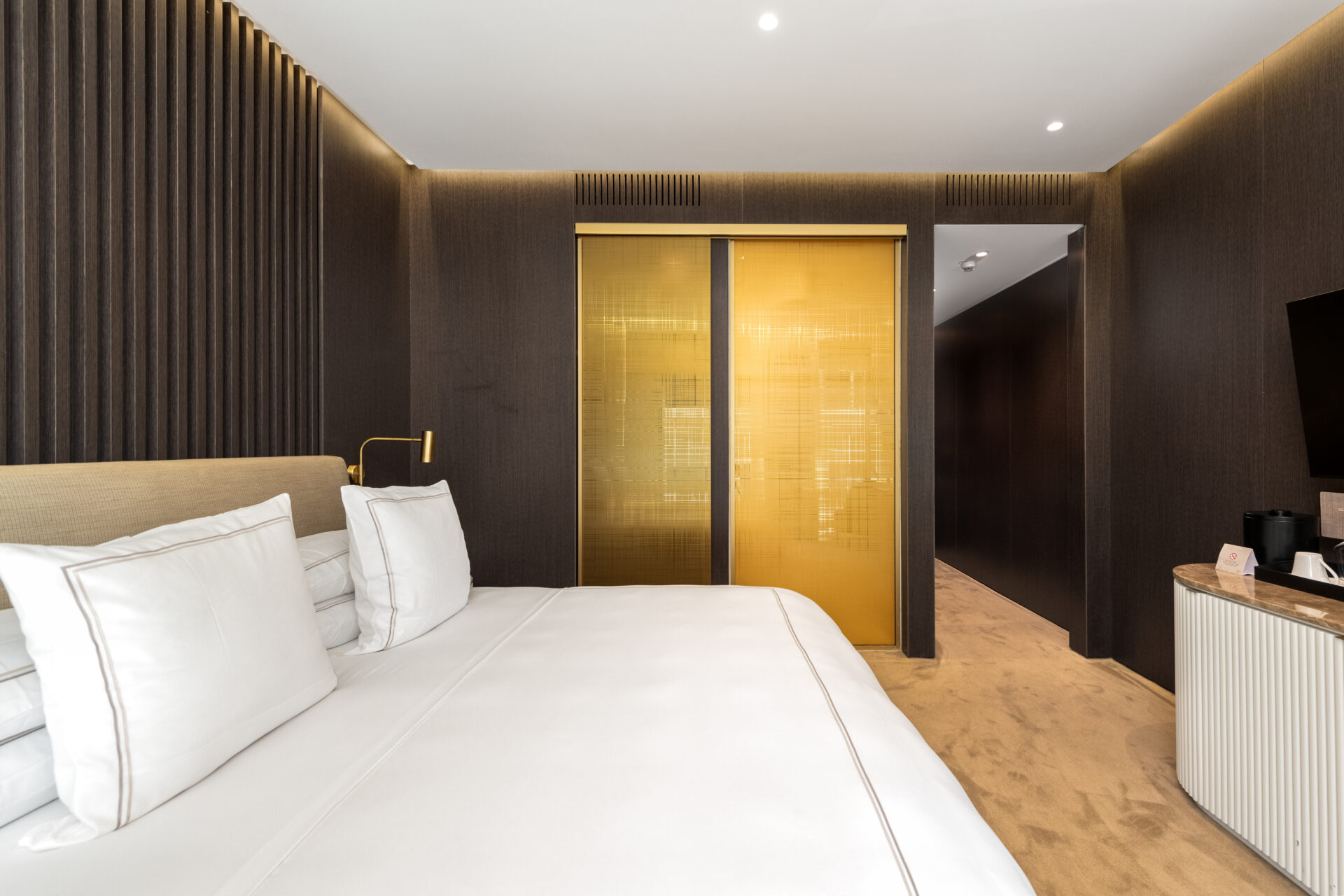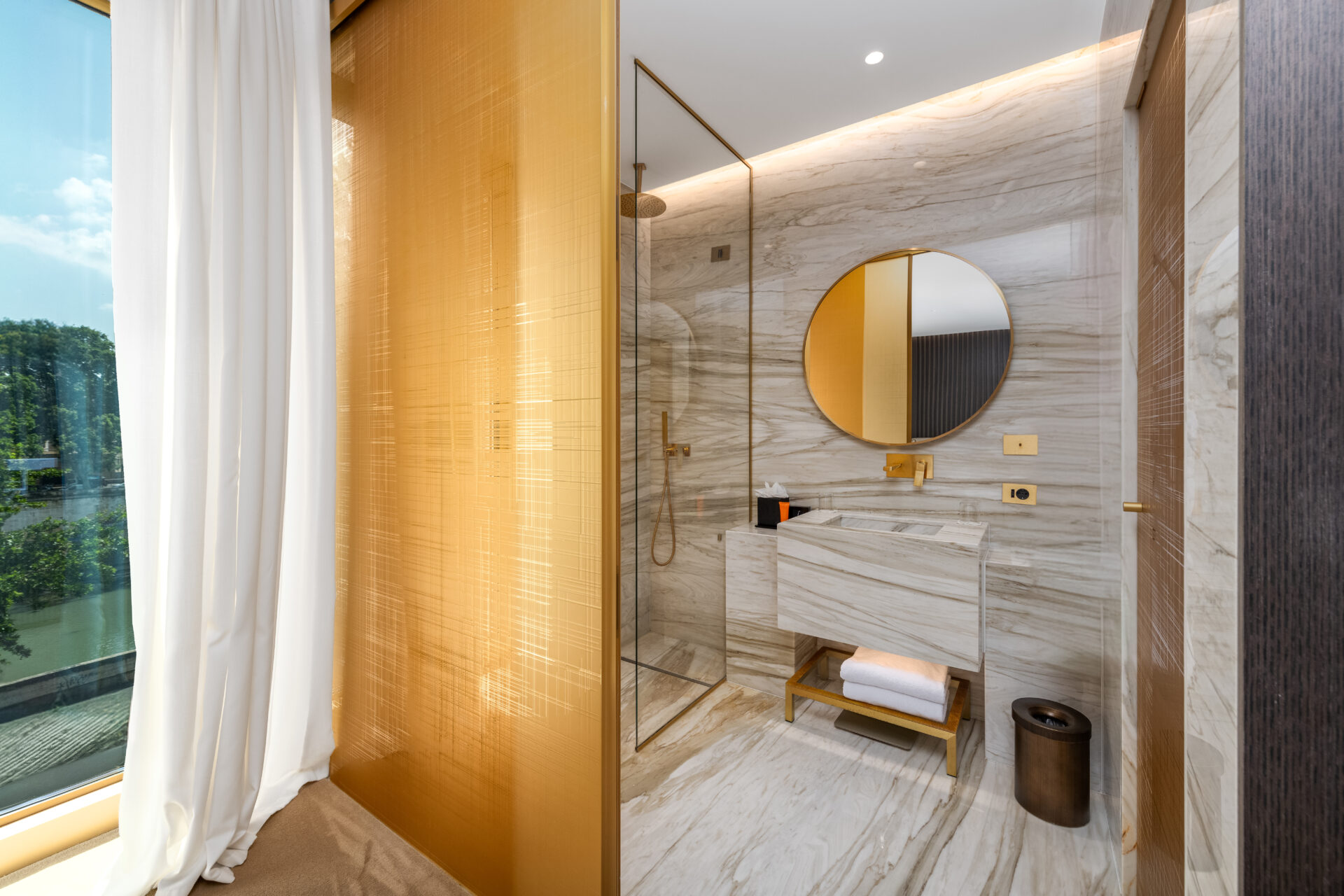 Gli ambienti interni sono caratterizzati da numerosi elementi in vetro, progettati per esaltare l’eleganza degli spazi e garantire una funzionalità sofisticata. In particolare, nelle camere sono stati installati sistemi scorrevoli e a battente con vetri stratificati, impreziositi da una texture tridimensionale e una tonalità oro raffinata, pensati per creare separazioni fluide e armoniose tra le diverse zone.