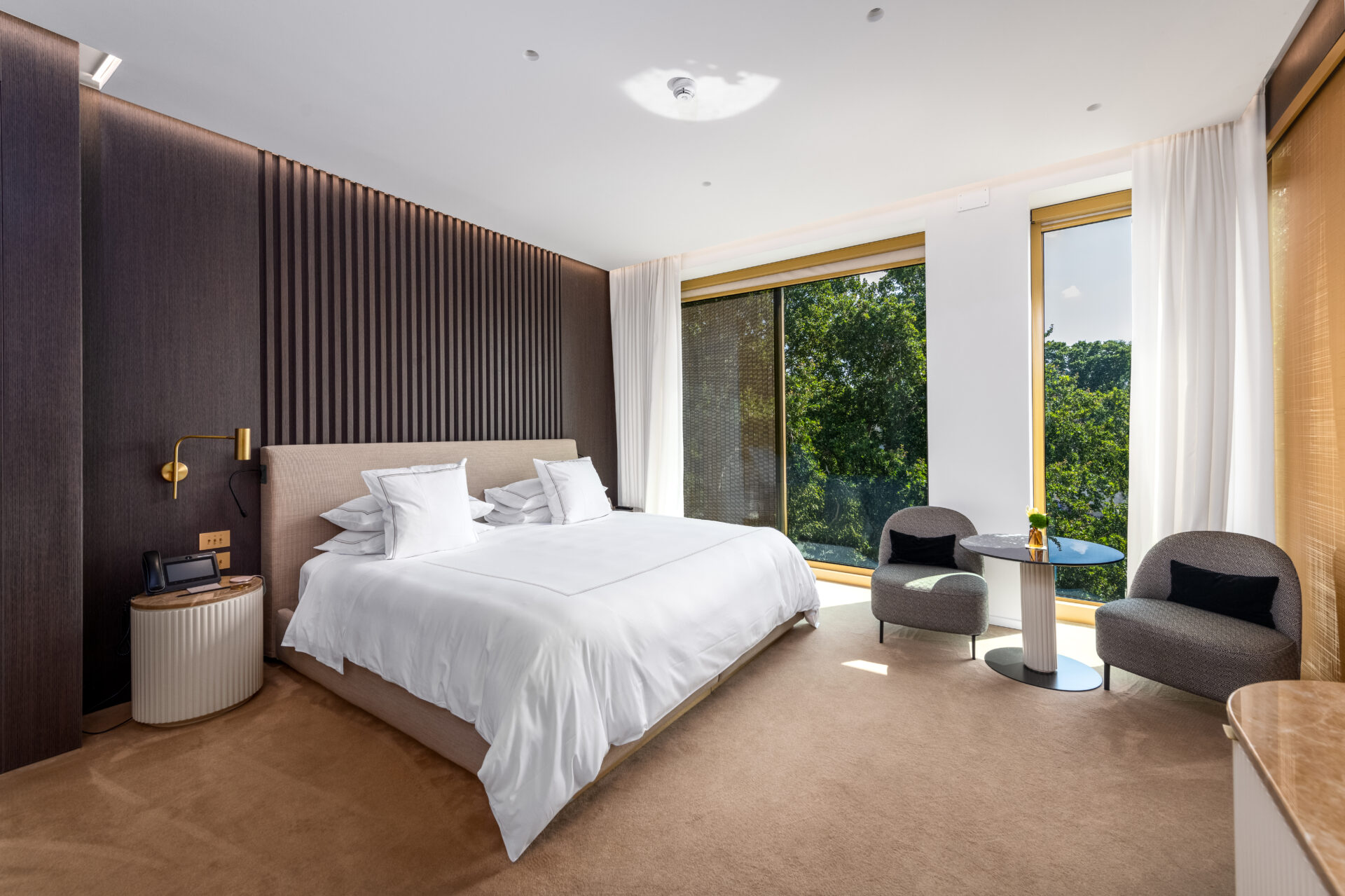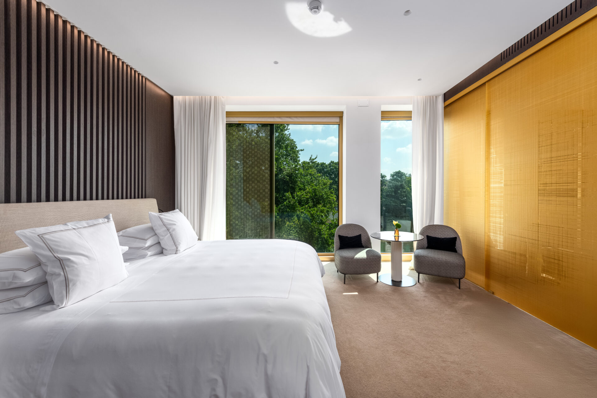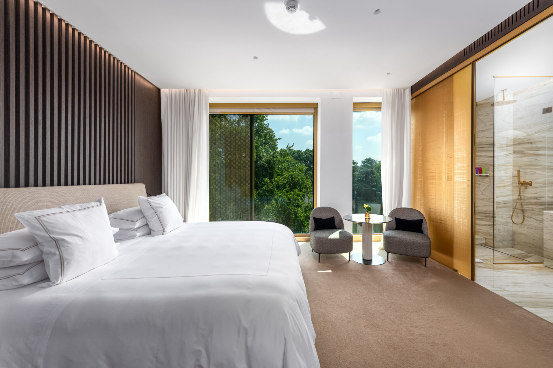 Gli ambienti interni sono caratterizzati da numerosi elementi in vetro, progettati per esaltare l’eleganza degli spazi e garantire una funzionalità sofisticata. In particolare, nelle camere sono stati installati sistemi scorrevoli e a battente con vetri stratificati, impreziositi da una texture tridimensionale e una tonalità oro raffinata, pensati per creare separazioni fluide e armoniose tra le diverse zone.