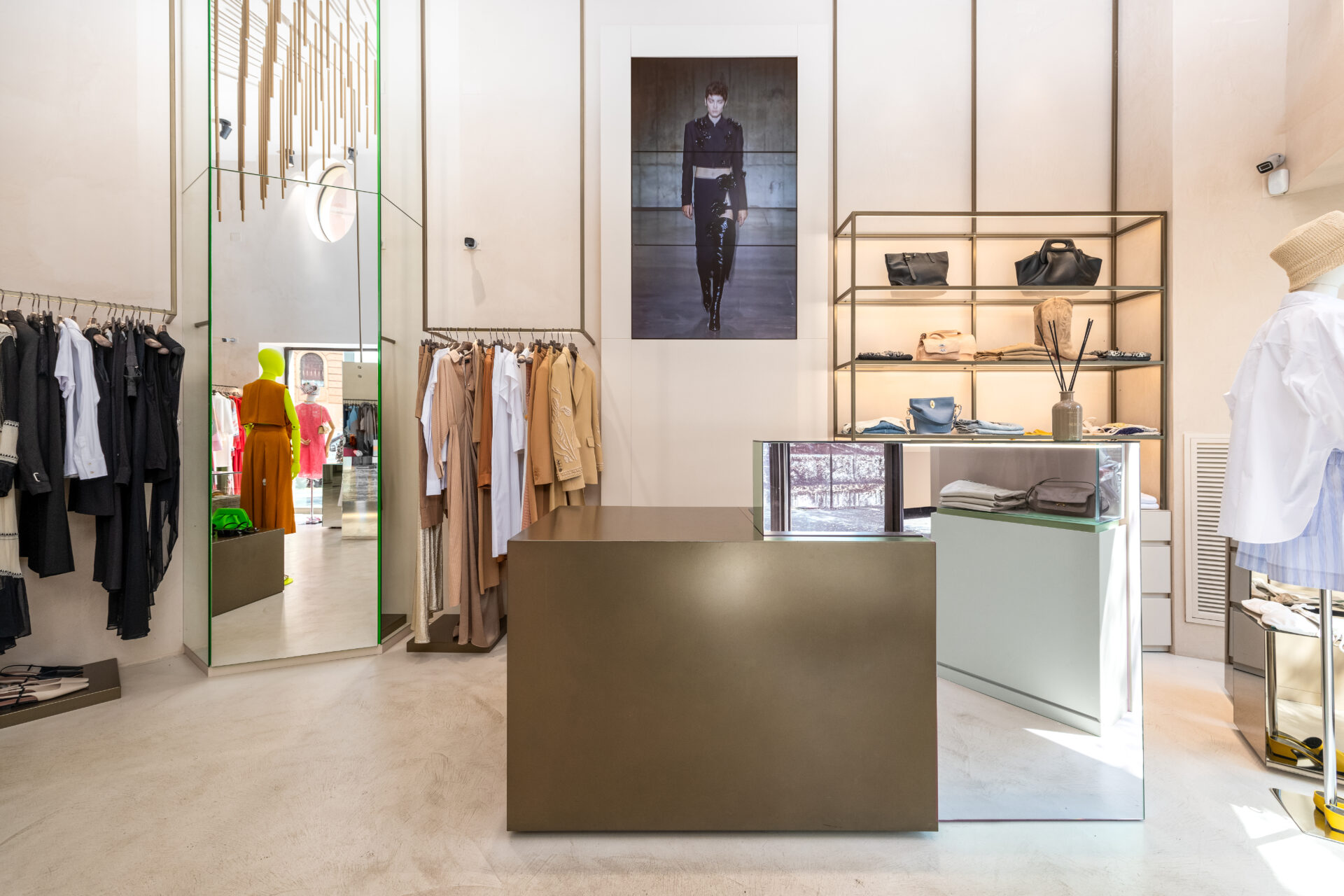 Completano l’intervento le vetrine espositive in vetro temperato, con lavorazioni su misura che mettono in risalto i capi con discrezione e raffinatezza.