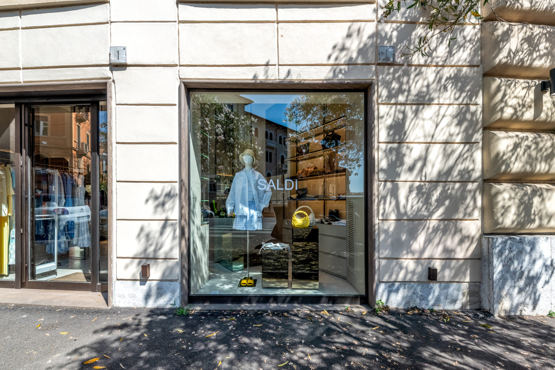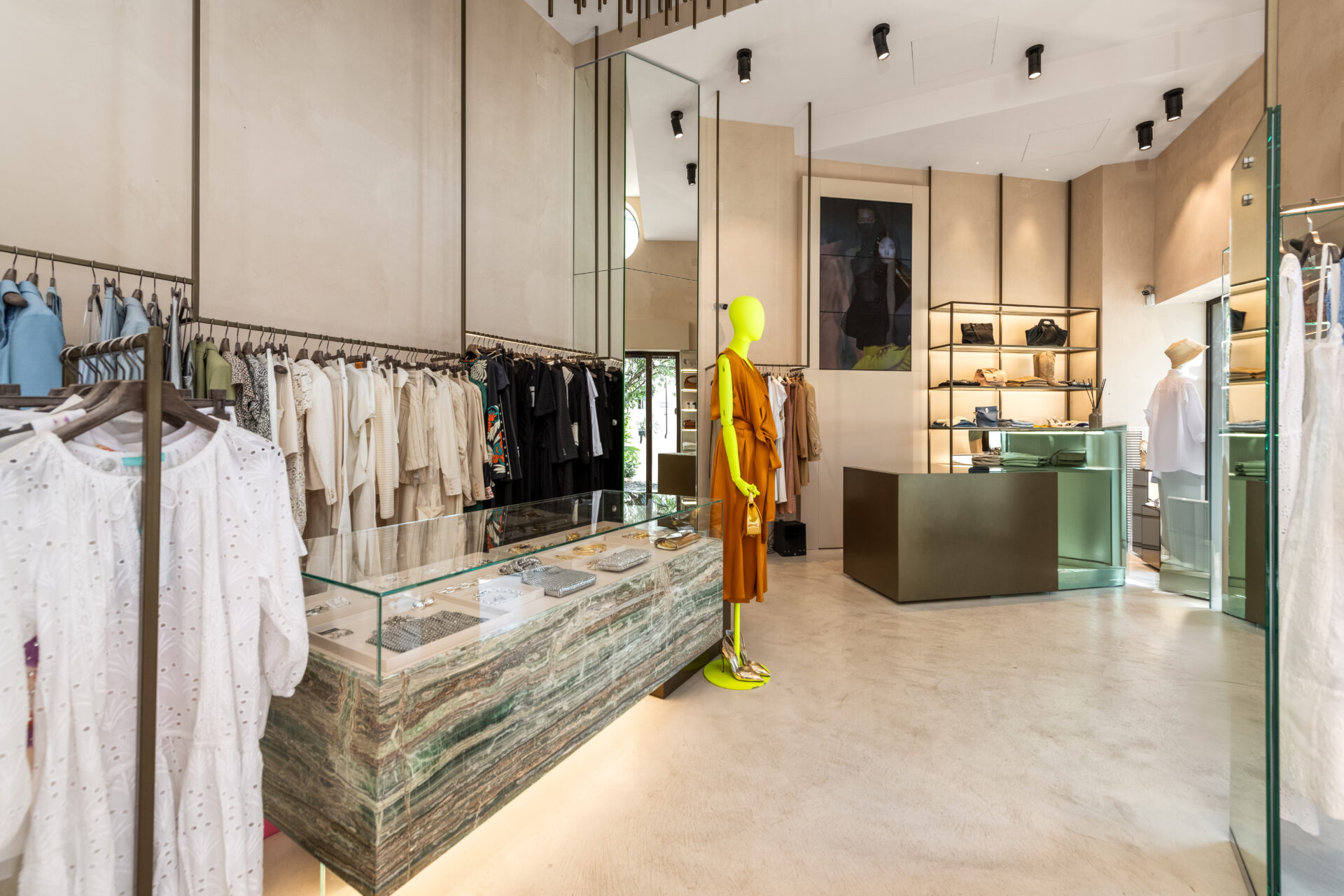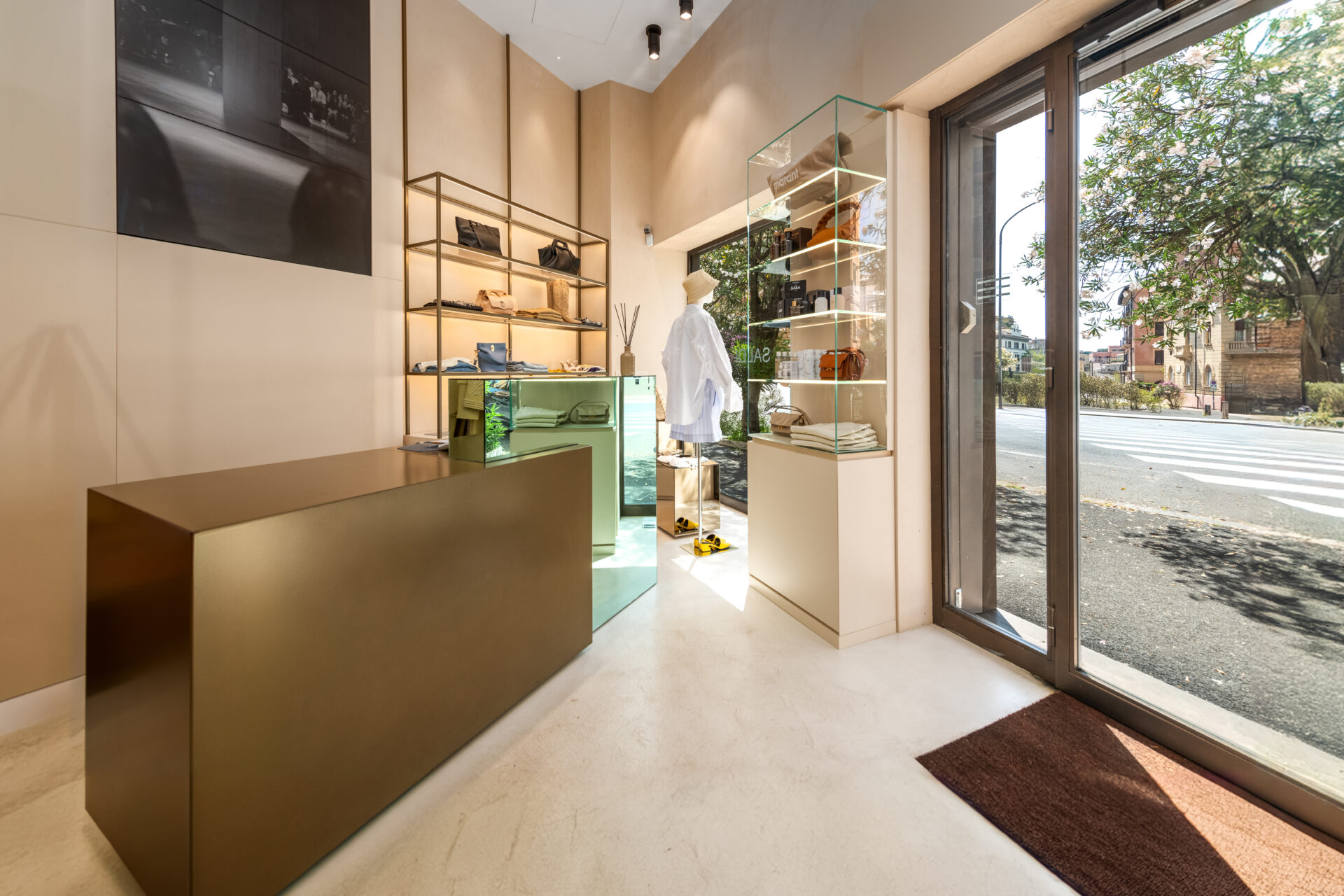 Completano l’intervento le vetrine espositive in vetro temperato, con lavorazioni su misura che mettono in risalto i capi con discrezione e raffinatezza.