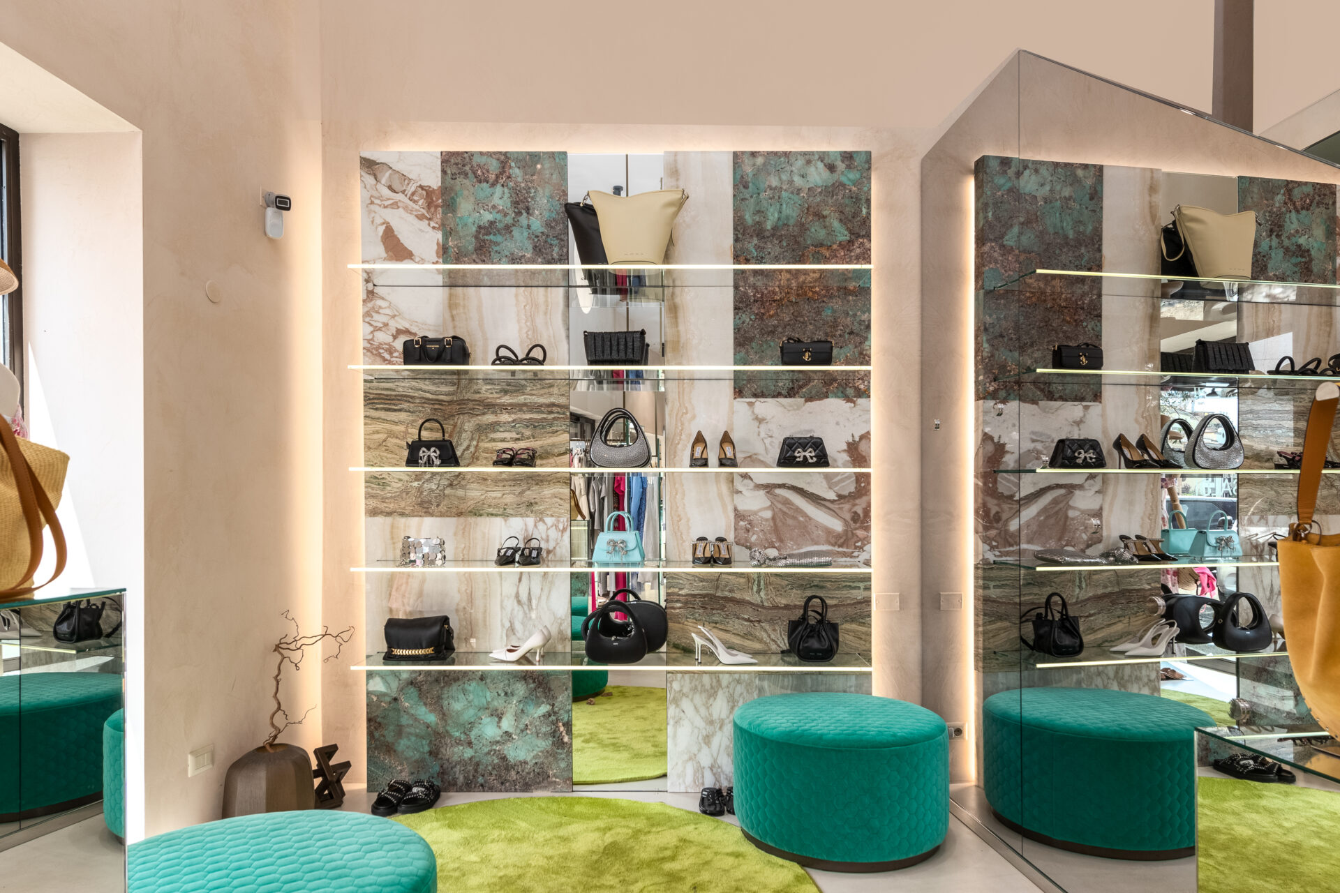Le mensole, incastonate nel marmo, sono impreziosite da profili a scomparsa e retroilluminazione LED, amplificando la percezione dello spazio e valorizzando l’esperienza della cliente all’interno del negozio.