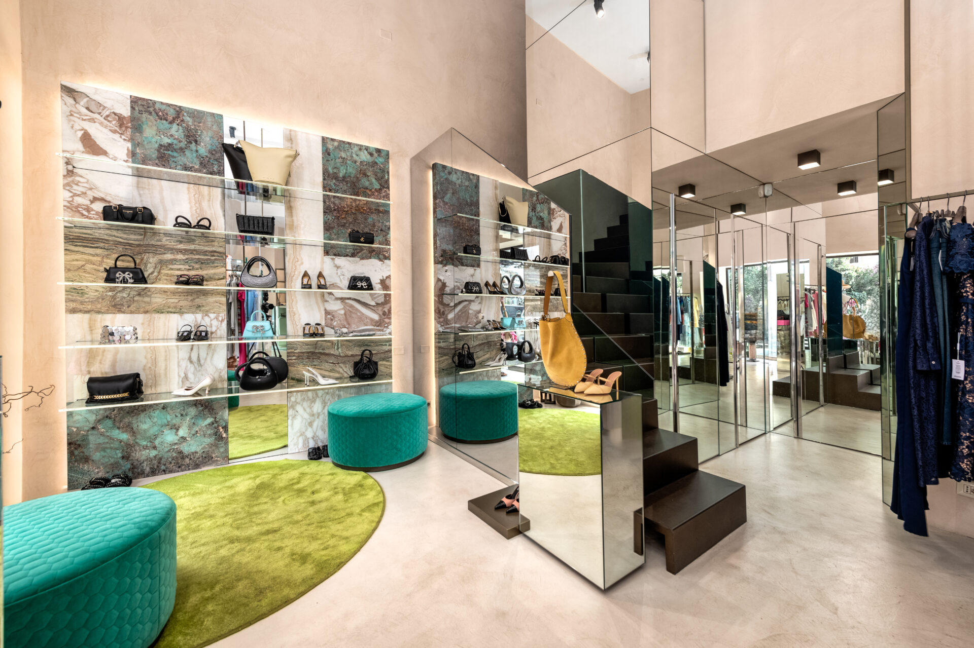 Abbiamo realizzato pareti e espositori rivestiti in specchio, declinati in cromie differenti, per creare giochi di luce e profondità che esaltano l’identità del brand.