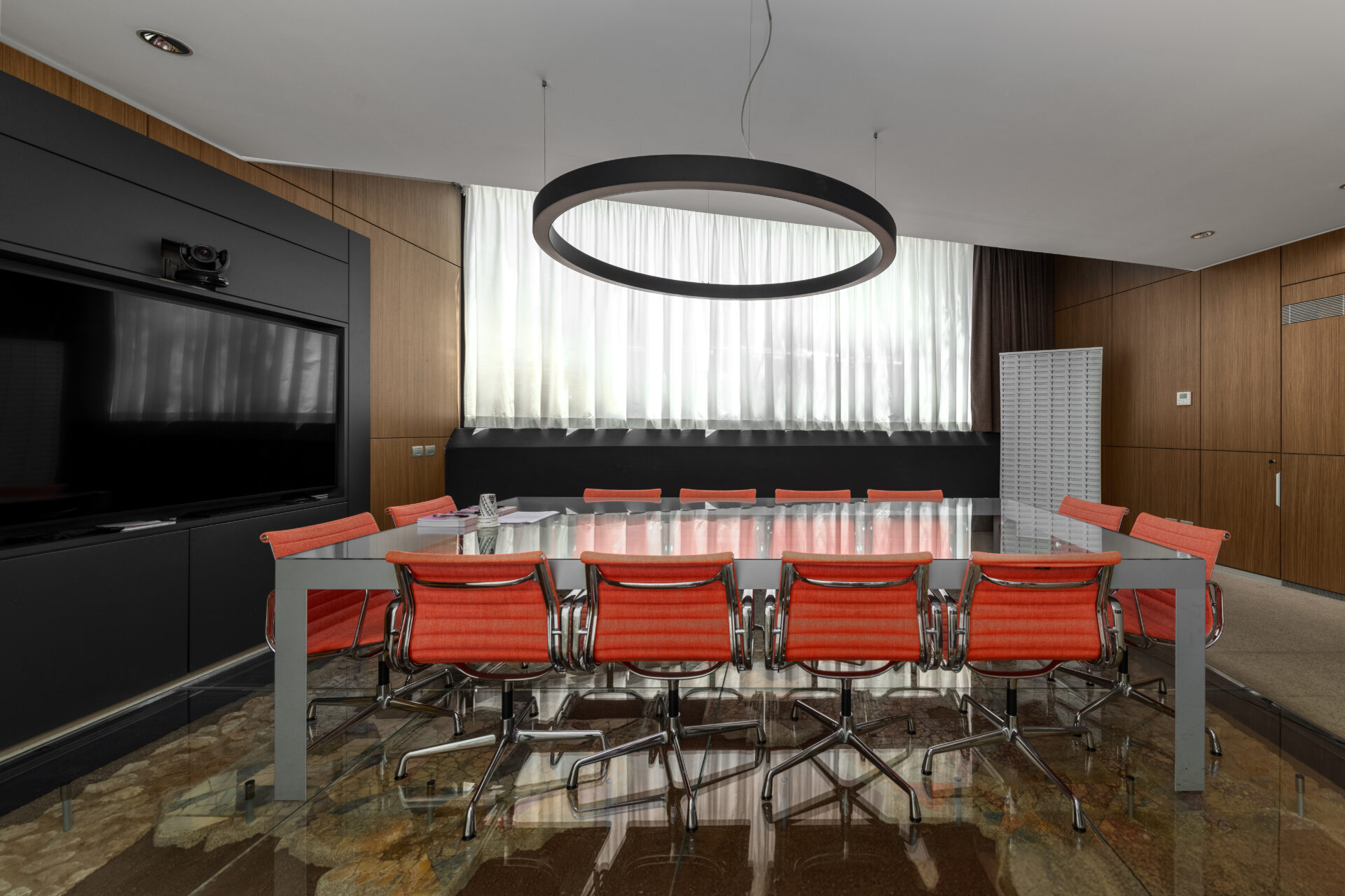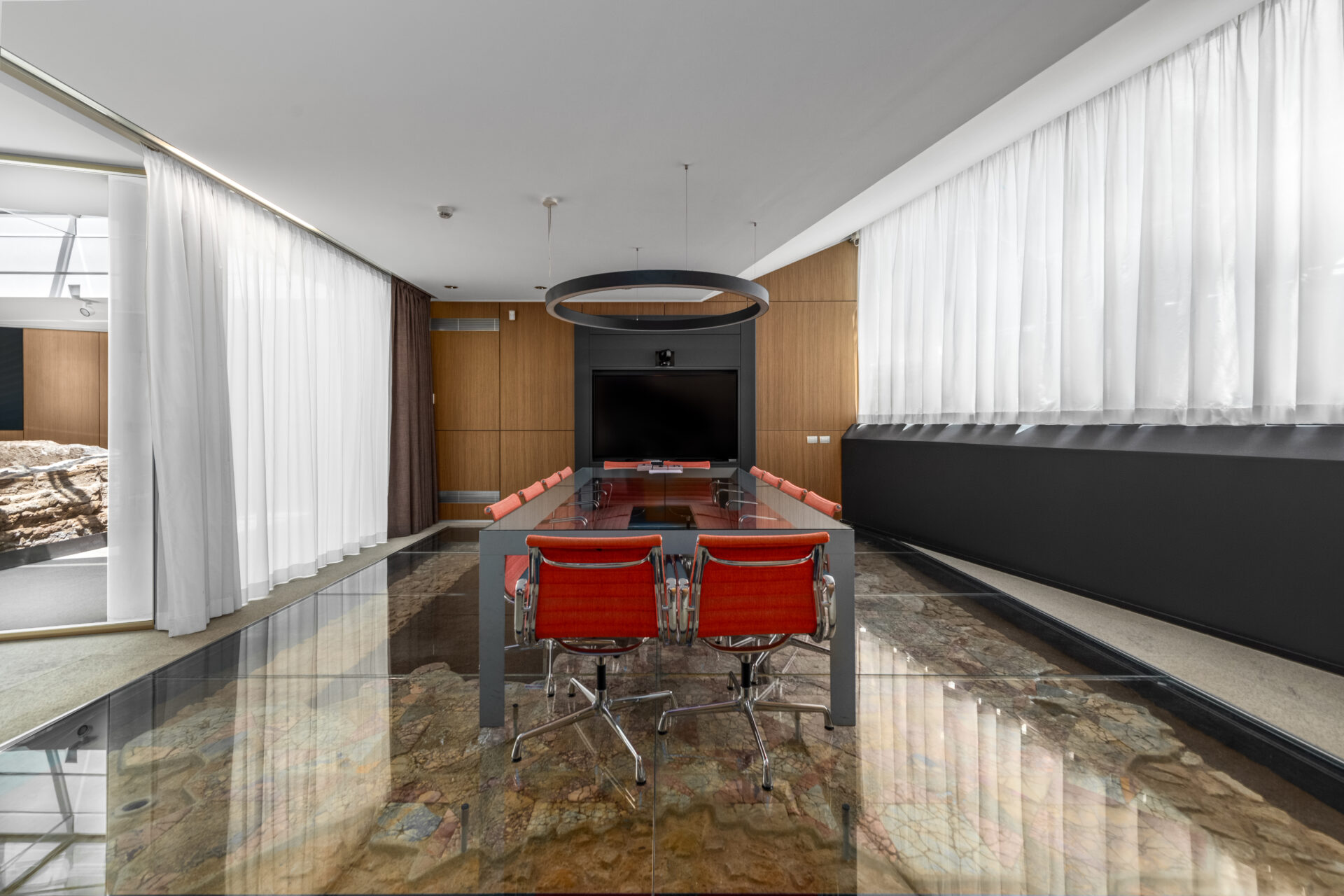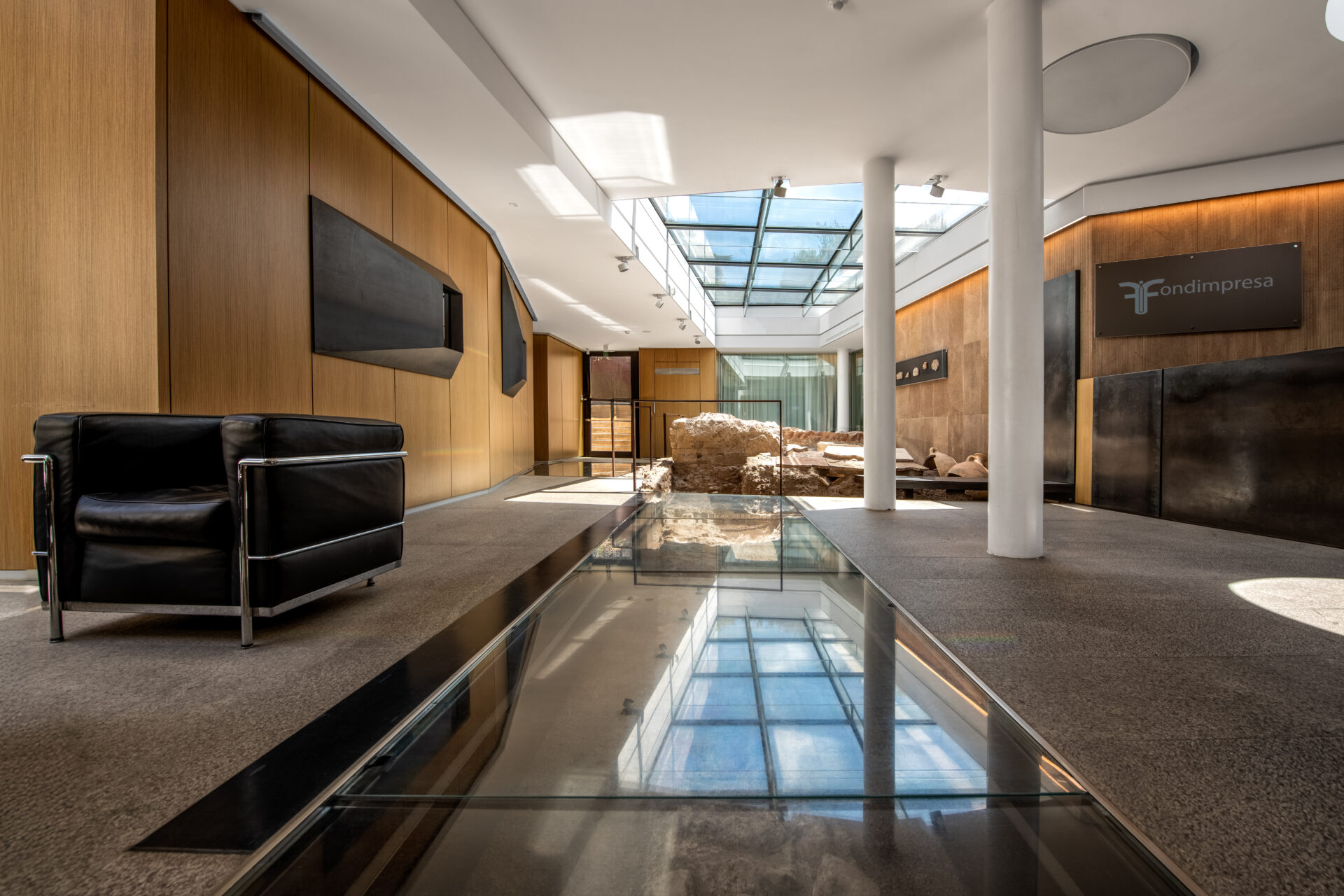 - Pavimento sopraelevato in vetro per la sala riunioni, progettato con particolare attenzione alla stratigrafia e alla distribuzione dei carichi. La sua realizzazione ha richiesto soluzioni ingegneristiche avanzate, poiché posto a protezione di una pavimentazione sottostante di epoca romana, vincolata e di elevato valore storico.